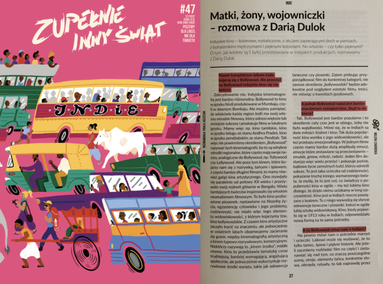 Najnowszy numer kwartalnika "Zupełnie Inny Świat" poświęcony jest Indiom. W przeprowadzonym przez Paulę Jaszczak wywiadzie opowiadam m.in. o tym, jak zmieniał się obraz kobiety i relacji genderowych w indyjskim kinie na przestrzeni dekad. Zwracam uwagę na praktyki cenzorskie i ich wpływ na kształt indyjskich filmów. Polecam również uwadze zdolne twórczynie, reżyserki i scenarzystki, które przełamują schematy. "Zupełnie Inny Świat" to społeczno-kulturowy kwartalnik tworzony przez ludzi z pasją, którzy odważnie podejmują istotne tematy często pomijane w debacie publicznej. Dostępny w Empiku.