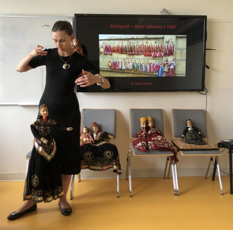 W dniach 27-28 lipca 2023 r. na zaproszenie gminy Stare Babice poprowadziłam warsztaty z animacji indyjskich marionetek teatralnych kathputli. Podczas letnich półkolonii opowiadałam o pracy lalkarzy w Indiach, technice wytwarzania marionetek, uczyłam także animacji. Edukacja kulturalna i kulturowa to jeden z obszarów mojej działalności eksperckiej. Za szczególnie istotne uważam poszerzanie horyzontów dzieci i młodzieży. Wiedza z zakresu dziedzictwa kulturowego pomaga zrozumieć to co nieznane, wspiera nawiązywanie relacji i rozumienie odmiennych społecznych kontekstów.