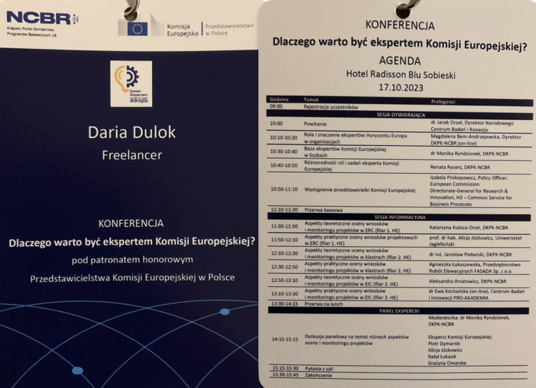 17 października 2023 r. uczestniczyłam w konferencji „Dlaczego warto być ekspertem Komisji Europejskiej?”, organizowanej przez Krajowy Punkt Kontaktowy Programów Badawczych NCBR w Hotelu Radisson Blu Sobieski w Warszawie. Cieszę się, że mogłam dowiedzieć się czegoś więcej na temat roli eksperta w Programie Ramowym Horyzont Europa. Konferencja była także okazją do pogłębienia wiedzy na temat grantów ERC. Profil ekspertki już utworzyłam. Mam nadzieję, że pojawi się możliwość współpracy przy ocenie projektów unijnych.