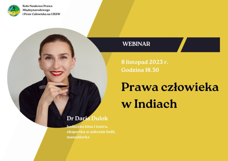 8 listopada 2023 r. wzięłam udział spotkaniu Koła Prawa Międzynarodowego i Praw Człowieka UKSW. Z przyjemnością wygłosiłam wykład o prawach człowieka w Indiach. Odwołałam się przede wszystkim do istotnych aspektów społeczno kulturowych, takich jak porządek kastowy i sytuacja religijna. Przedstawiłam kwestię praw człowieka z punktu widzenia Konstytucji Indii i najnowszych zmian legislacyjnych. Zwróciłam uwagę na najważniejsze pola potencjalnej dyskryminacji w Indiach. Dziękuję za ważne pytania: o sytuację kobiet w Indiach, karę śmierci, kastowość. Z pewnością będą dla mnie bodźcem do dalszej pracy badawczej.