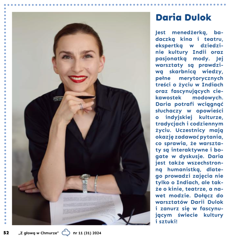 Współpracuję ze Szkołą w Chmurze od października 2023 roku. Szkoła w Chmurze to inkluzywne i pełne tolerancji miejsce, gdzie każdy może być sobą. Bycie częścią tej społeczności to dla mnie duża satysfakcja. Z pasją i radością dzielę się wiedzą o Indiach, kinie, teatrze, a także modzie podczas cotygodniowych zajęć dla dzieci i młodzieży. Szkoła w Chmurze daje młodym ludziom przestrzeń do aktywnego i kreatywnego rozwoju, a także współtworzenia chmurkowej społeczności. Miesięcznik "Z głową w CHMURZE" jest tego najlepszym przykładem. W każdym numerze publikowane są artykuły autorstwa młodych i zdolnych uczniów i uczennic Szkoły w Chmurze. Dla uczniów do szansa na wzmocnienie swojego głosu i poczucia sprawczości, dla nas - doskonała lektura i spojrzenie w świat młodego człowieka. W listopadowym numerze zaprezentowano moją sylwetkę jako warsztatowczyni. Radość i duma!