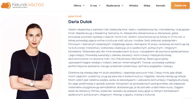 Rozpoczęłam kolejną obiecującą współpracę tym razem jako lektorka języka hindi w centrum językowym Kierunek Wschód. Kierunek Wschód pozwala uczyć się wschodnich języków: arabskiego, chińskiego, japońskiego i wielu innych. Dla mnie edukacja międzykulturowa jest kluczowa. Dlatego moje podejście do nauczania języka hindi zakłada przenikanie się umiejętności językowych i kulturowej interpretacji. Gdy uczę hindi, uczę kultury. Moje lekcje to przestrzeń dla zrozumienia indyjskiej kultury, społeczeństwa i codzienności.